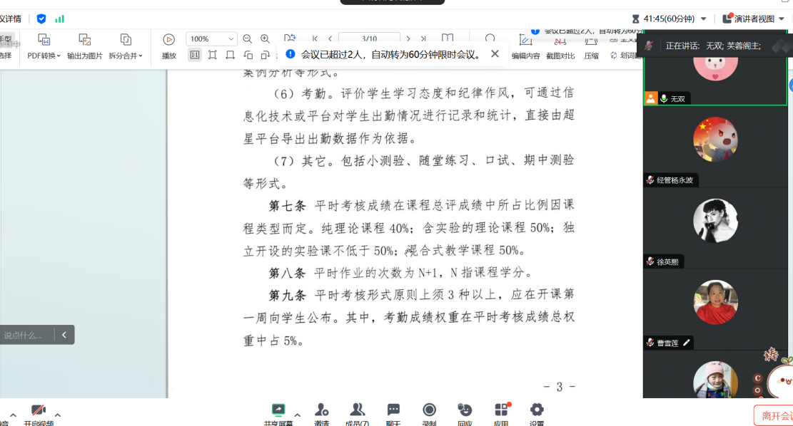 吴主任首先详细阐述了本学期论文工作的具体时间安排,并着重强调各位课程组长需密切跟进论文相关工作,确保各项任务按时完成。随后,她深入探讨了教师个人发展问题,鼓励每位教师认真研读学校相关文件,积极把握职称申报的机会。此外,吴主任还详细解读了学校下发的《课程考核管理办法》中的关键内容,特别强调了教学大纲中平时成绩比例的设置要求,并强调各位课程组负责人带领组内教师切实做好期中教学资料的审查工作。同时,她介绍了期末考试制卷的注意事项,特别指出了与以往相比,新规定中的若干不同之处,旨在引导教师们精准把握制卷要求,促进工作的规范化与高效化,最后,吴主任与付荣老师就学科竞赛的相关议题进行了深入探讨。