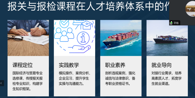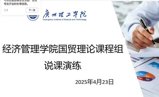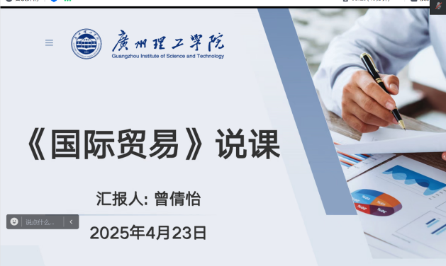 (通讯员:徐英熙)为贯彻落实本科教学合格评估指标体系标准,扎实推进广州理工质评函〔2025〕17 号文件部署的检查工作,suncitygroup太阳集团国贸系国贸理论课程组依据《suncitygroup太阳集团 “五说” 演练活动方案》相关要求,于 2025 年 4 月 23 日通过线上平台,组织开展了说课模拟演练活动。此次演练会由课程组组长徐英熙老师主持,课程组成员许旭、胡玲等共7位教师以饱满的热情全身心投入,以精益求精的态度积极参与说课演练 。