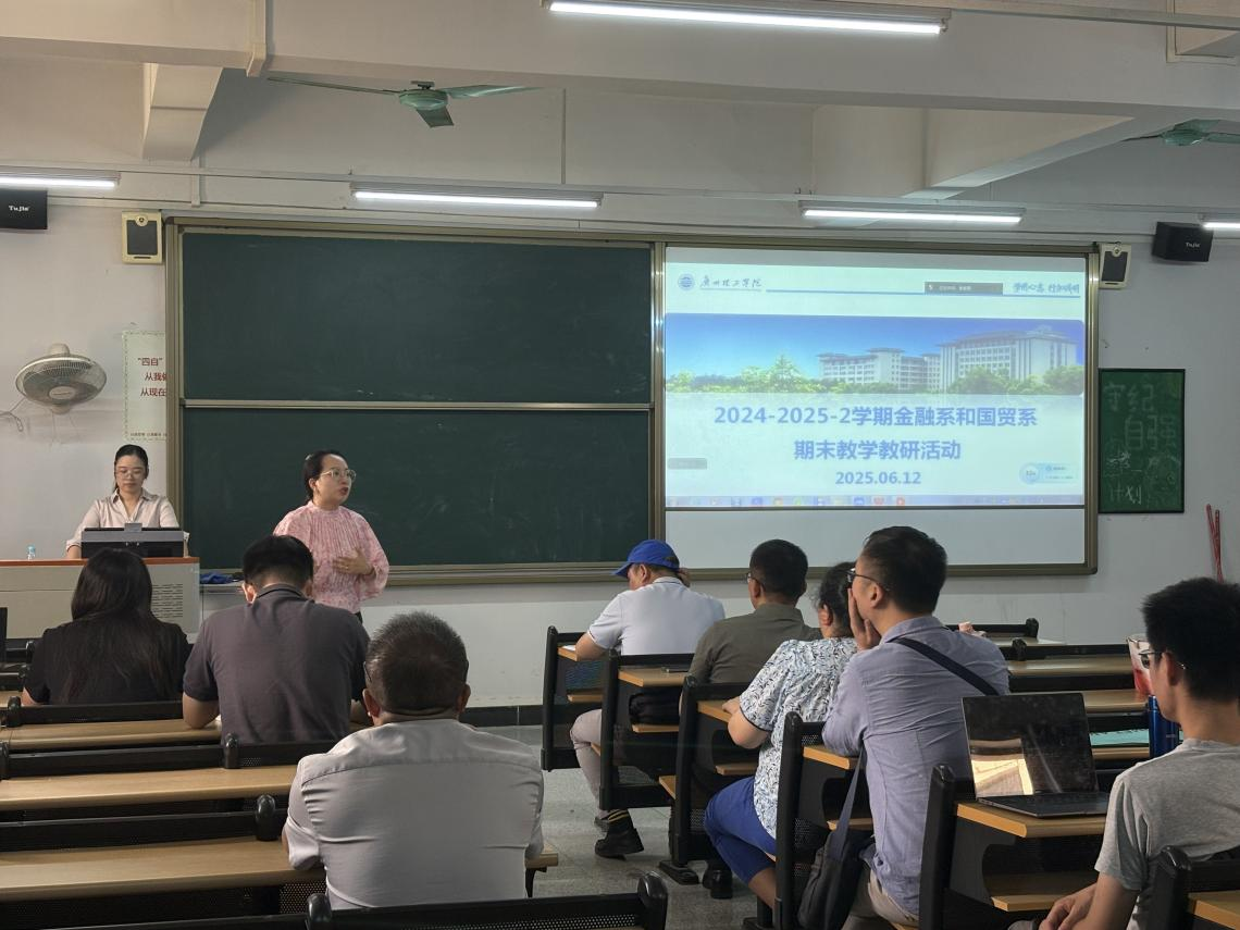 (通讯员:徐英熙)2025年6月12日下午,suncitygroup太阳集团金融系和国贸系在1-901开展期末教学教研研讨会,围绕本科毕业论文评估、2024级教学大纲编制、期末课程资料准备及硕士点建设等多项重点教学工作进行全面部署,旨在进一步提升教学质量,推动学科发展迈向新台阶。会议由金融系黄爱青主任、国贸系吴霜主任共同主持,两系教师悉数参会。