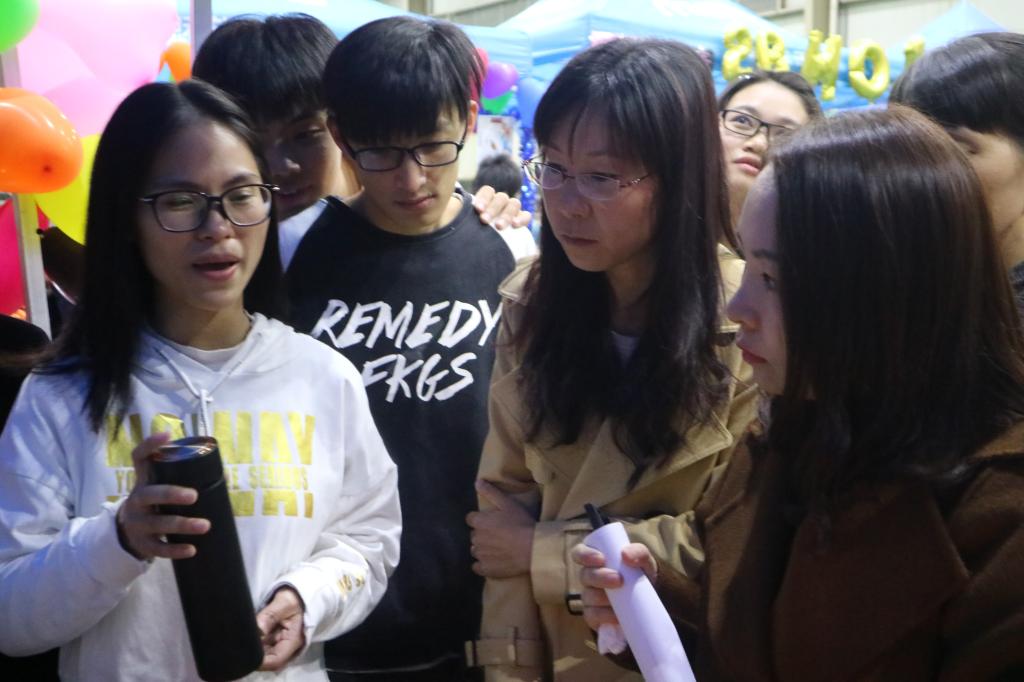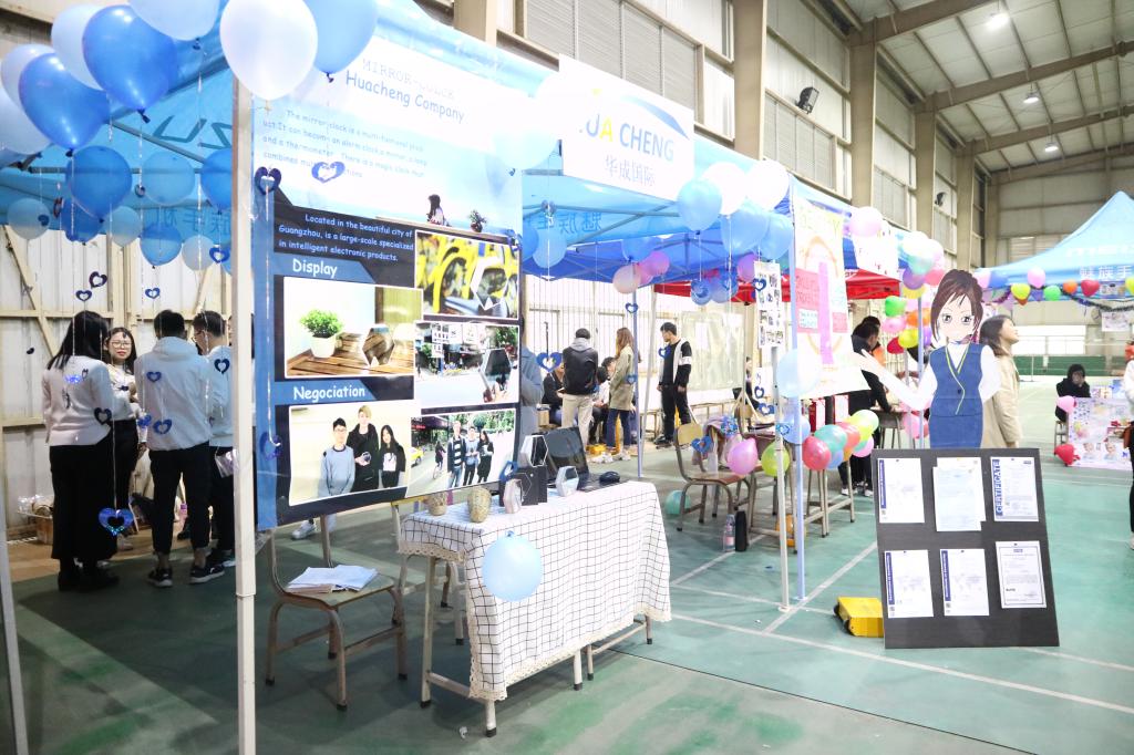 第二环节为贸易谈判。选手们用专业的贸易术语与作进口商的评委们进行贸易磋商、交流,展示着各自娴熟的国贸技能。同时,精美、富有创意的商品海报和亮丽多彩的展位布置赢得评委们的好评。
