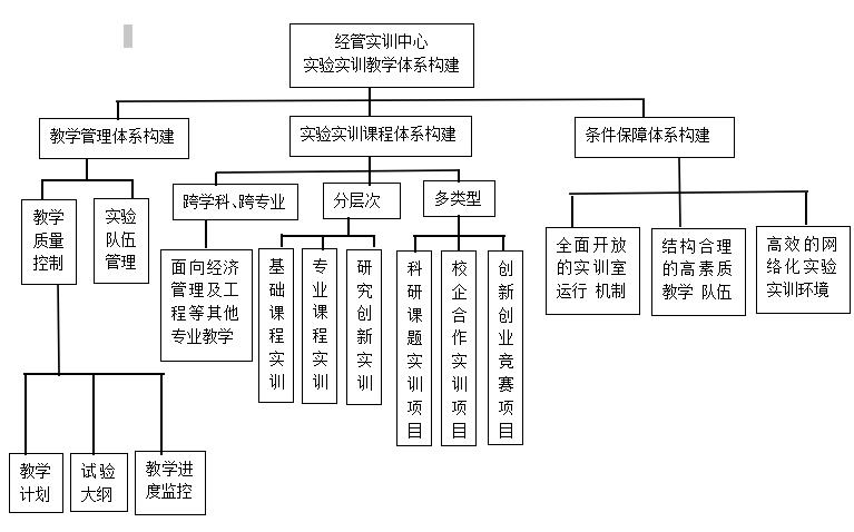 经管实训中心根据学科专业特点和我校人才培养目标,结合国内同类院校的文科实验教学改革发展趋势及中心实际情况,依据国家级实验教学中心建设标准,围绕“实验实训课程体系构建”、“教学管理体系构建”和“条件保障体系构建”三方面开展工作,构建实验实训教学体系(见下图)。其中,课程体系是核心,管理体系是手段,条件保障体系是保证,确保实验实训教学落到实处。